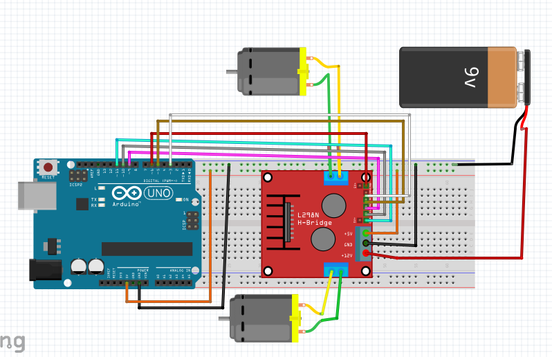 Öncelikle L298N motor sürücüsündeki 12V ucunu, 9v pilimizdeki (+) ucuna bağlıyoruz. Arduino Uno’daki GND Ucunfan çektiğimiz kablo ile pilimizdeki (-) ucu birleştirip L298N motorundaki GND ucunu bağlıyoruz. Motor sürücümüzdeki 5v ise arduino kartımızdaki 5V kısmına bağlıyoruz. Eğer, motorumuz sabit hızla gitmesini istmiyorsak motor sürücümüzdeki Enable uçlarında bulunan kelepçeleri kaldırıyoruz. Ortaya iki tane pin çıkacak. Öndeki pini jumper kablo ile arduino kartımızdaki PWM pinlerinden birine bağlıyoruz ben 11 PWM(ENA ucu) ve 6 PWM(ENB ucu) pinine bağladım.(Eğer sabit hızda çalışacaksa motor bu Enable(ENA,ENB uçlarını kullanmanıza gerek yok) Sonra N1, N2,N3 ve N4 uçlarından kablo ile arduino kartımıza bağlantı kuruyoruz. Motorumuzun uçlarını  Out1, Out2, Out3 ve Out4 uçlarına bağlayalım. Bağlantı sıralaması önemli değil.